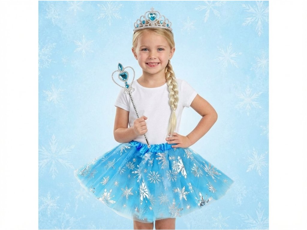 Kostým obsahuje: korunku, žezlo a tylovú mrazenú sukničku (veľkosť uni, sedí na 3-9 rokov).