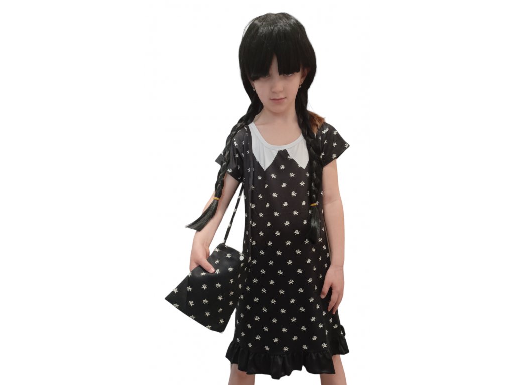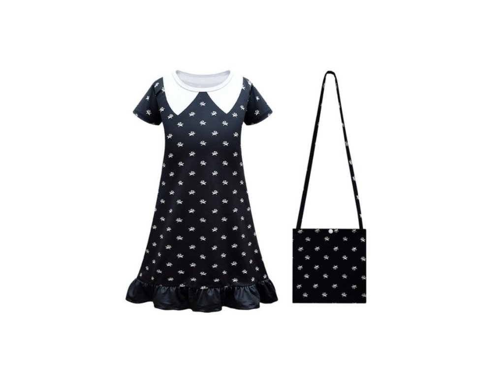 Šaty sú čierne s bielym vzorom, krátkym rukávom a s kabelkou.